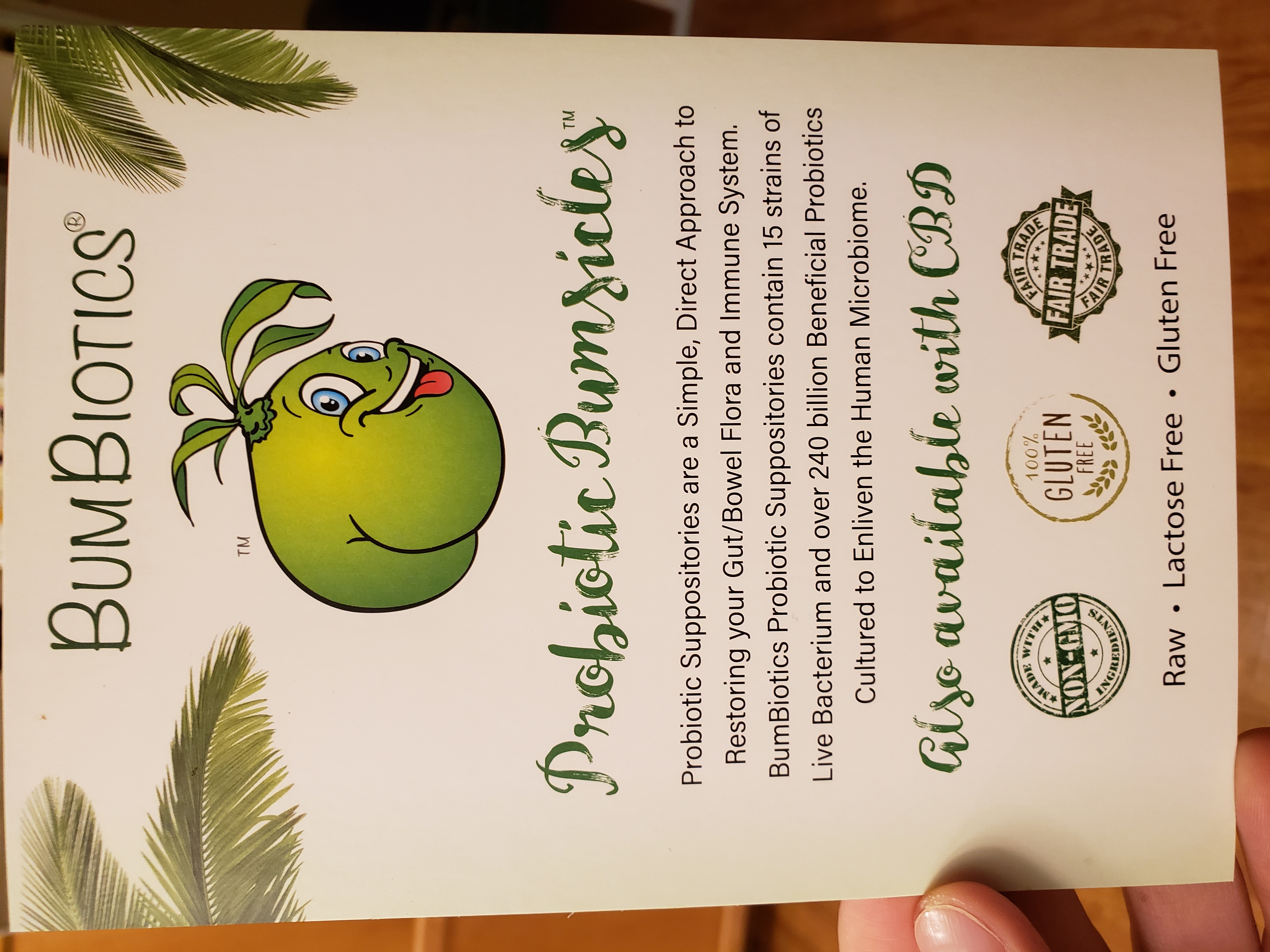 BumBiotics is a California based company that offers clean coconut based probiotic products free from dairy, lactose, wheat, gluten, soy, corn, eggs, yeast, artificial flavors, preservatives or GMO! And for those of you who are interested, they are also environmentally aware and use recycled paper and vegan dyes for printing. BumBiotics’ website boasts some impressive testimonials for their probiotics and needless to say I was very intrigued after reading some of the reviews. So why isn’t everyone on the BumBiotics bandwagon? Because traditional probiotics go in your mouth, but BumBiotics have one hold up… that’s right… as the name implies it, they go in your bum.